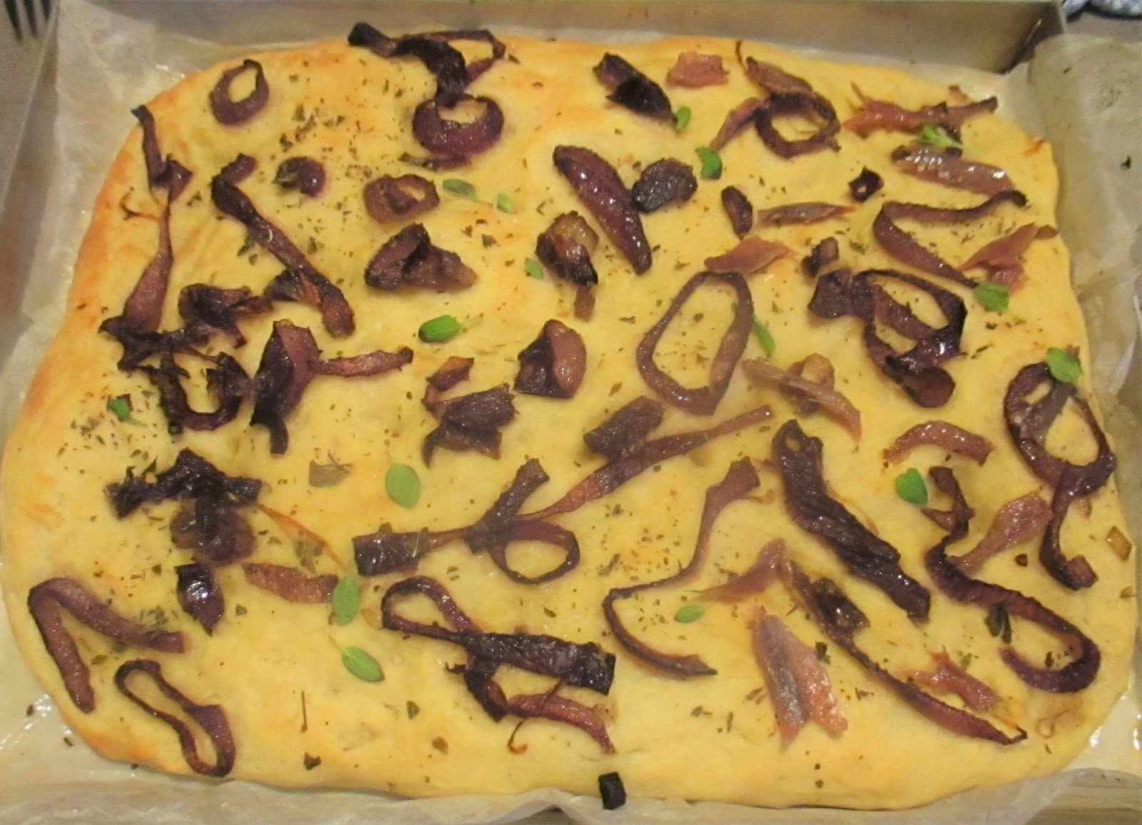 FOCACCIA FATTA IN CASA ALLE CIPOLLE ROSSE, ACCIUGHE E ORIGANO