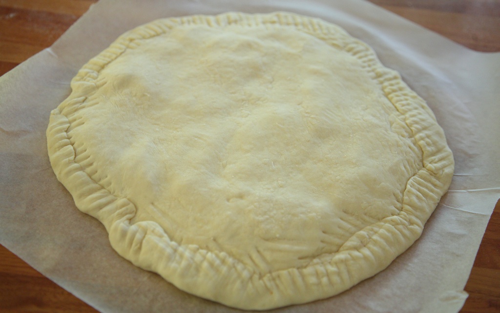 Sigillare i bordi tirando un pochino la sfoglia dalla base e chiudere bene utilizzando i rebbi di una forchetta.