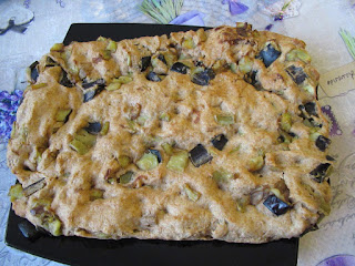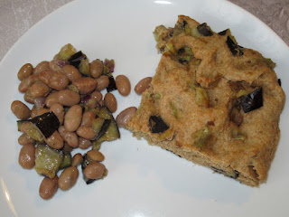 Friggere le melanzane a cubetti. Impastare tutti gli ingredienti, aggiungere la metà delle melanzane e stendere su un foglio di cartaforno su una teglia. Infornare a 180° per 20 – 25 minuti. Nel frattempo saltare in padella un’abbondante manciata di fagioli borlotti già cotti con un filo d’olio ed aggiungere le melanzane, aggiungere il sale e portare in tavola con la focaccia.