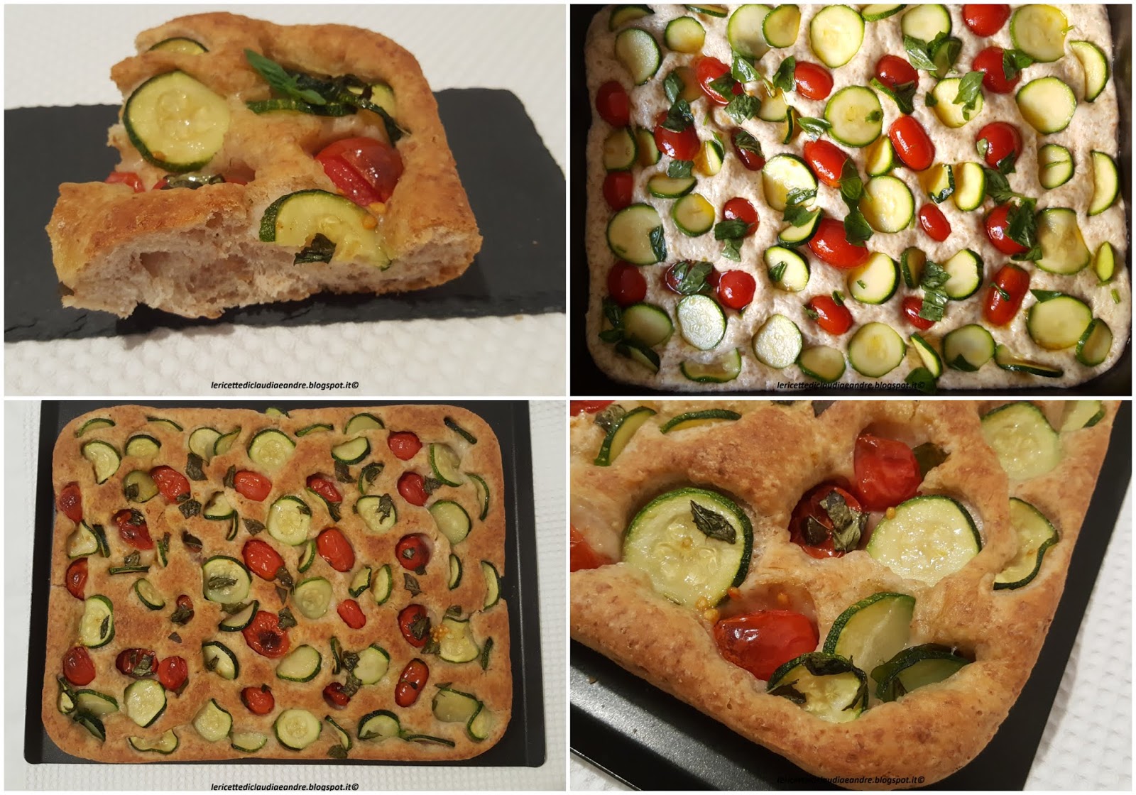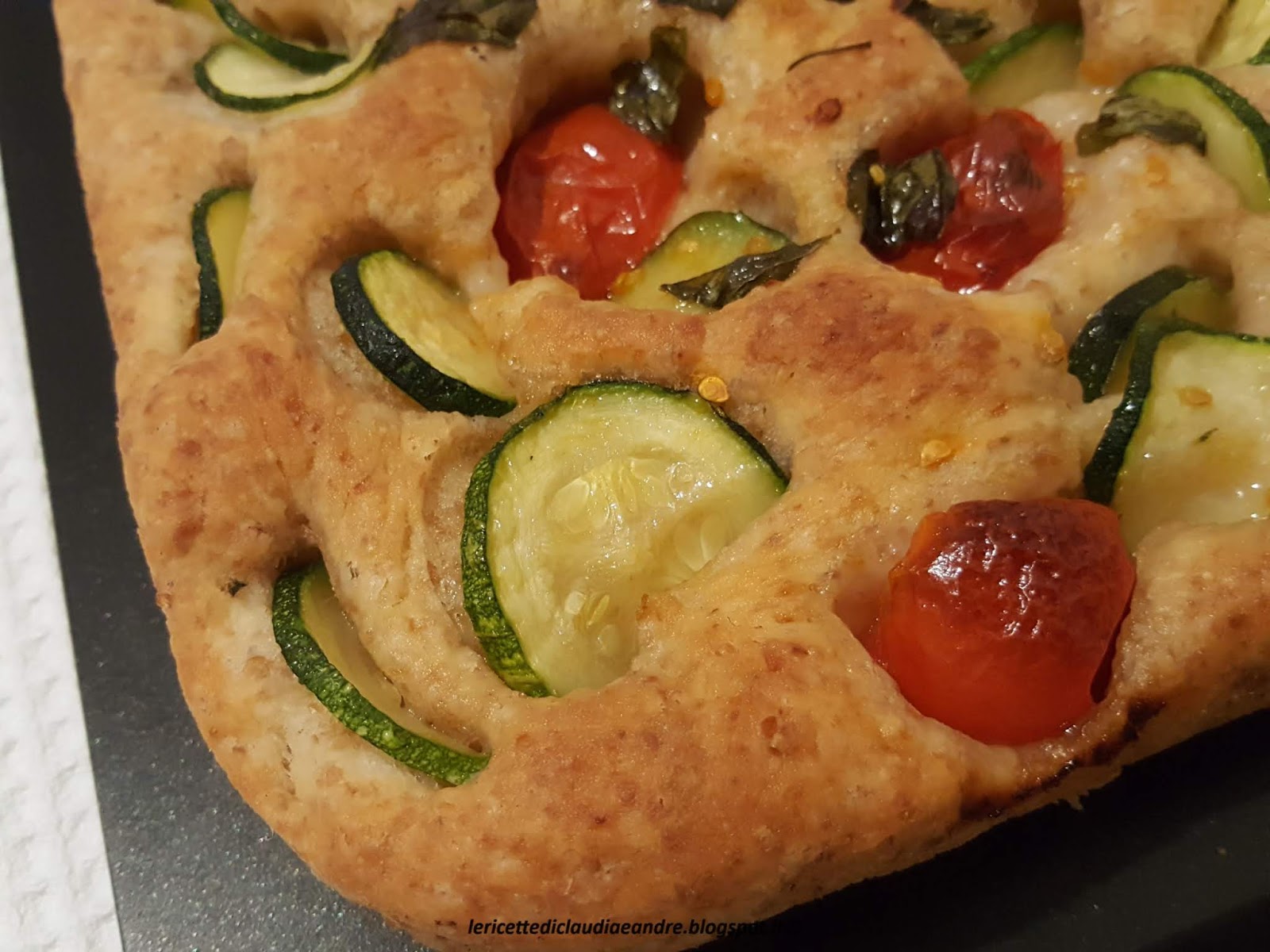 - Riprendere l’impasto, rovesciarlo su un piano infarinato, passare sopra il mattarello e fare un rettangolo della dimensione di una teglia di circa 37 x 24 cm e sistemarla dentro, oliando in precedenza. Distribuire sopra zucchine e pomodorini.