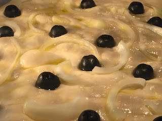 Con le dita fare i buchi nell’impasto e infine guarnire con la cipolla precedentemente affettata e con rondelle di olive nere.