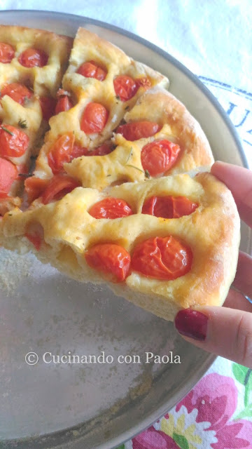Affondate i pomodorini tagliati nell’impasto, cospargete la superficie con un pizzico di origano e una presa di sale. Lasciate lievitare le focacce coperte per un’altra ora e conditele con 200 ml di acqua e 3 cucchiai di olio. Cuocete in forno a 220°C per circa 30 minuti.