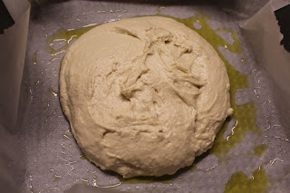 Foderare una teglia non troppo grande ( se volete una focaccia bella alta) con carta forno e ungete con olio.