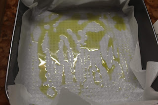 Foderare una teglia non troppo grande ( se volete una focaccia bella alta) con carta forno e ungete con olio.