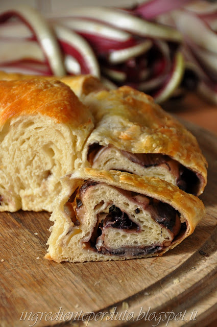 Far appassire in poco olio la cipolla tagliata finemente, quindi aggiungere il radicchio tagliato grossolanamente, fatelo appassire e poi unire il vino e proseguire la cottura sino ad asciugare il composto e fate raffreddare.
