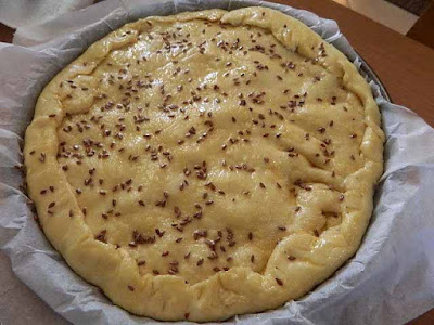 quindi spennellare la superficie della focaccia con olio di semi di girasole e, se volete potete guarnire con semi di lino.