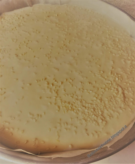 Prima di infornare la focaccia spennelliamo la superficie con del latte e cospargiamo con semi di sesamo.