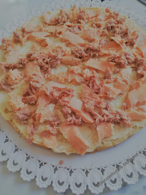 Spalmiamo con la maionese, aggiungiamo il tonno ed il salmone sbriciolato,