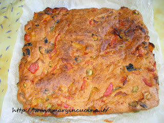 400 gr farina integrale di farro appena macinata, 40 gr farina di ceci appena macinata, 320 ml acqua, 80 ml olio extravergine d’oliva, 4 cucchiai di lievito alimentare in scaglie, sale integrale, 1 bustina di lievito istantaneo per torte salate. 1 melanzana, 2 zucchine, 1 peperone, 5 -6 pomodorini, 1 cipollotto.