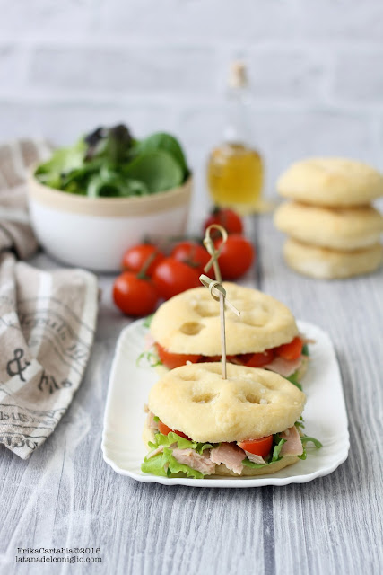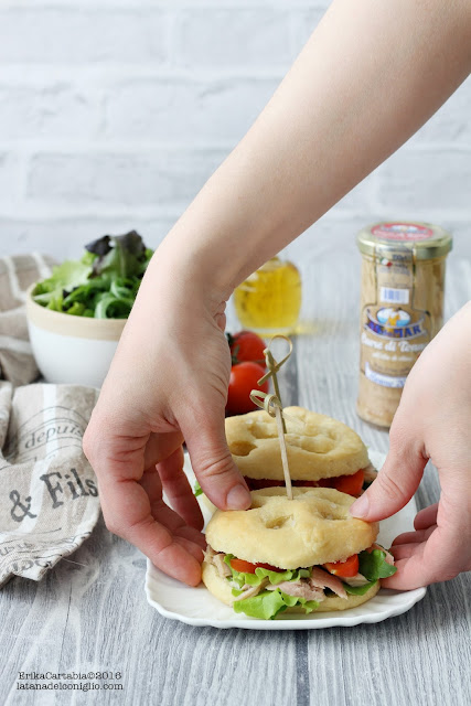 Fate quindi cuocere per circa 15 minuti. I tempi di cottura possono variare in base alle dimensioni delle focacce e alla temperatura del forno). Non appena inizieranno a dorarsi, ma risulteranno ben morbide saranno pronte. Sfornate e lasciate raffreddare prima di tagliarle a metà e farcirle con un cucchiaino di patè di olive, qualche foglia di insalata, pomodorini a spicchi e generosi filetti di cuore di tonno.