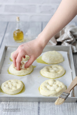In un bicchiere unite acqua e olio evo in parti uguali, unite il sale fino e mescolate bene. Spennellate la superficie di ogni focaccina con una quantità abbondante dell’emulsione ottenuta. Con le dita praticate delle leggere conche sulla superficie di ogni focaccia.