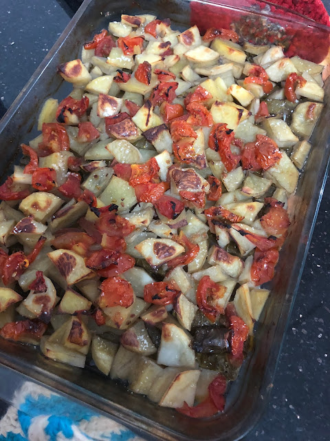 5. Appoggiate tutte le foglie arrotolate una vicino l’altra su una teglia, mettete le patate e i pomodori sopra, condite con sale e pepe e versate un poco di acqua.