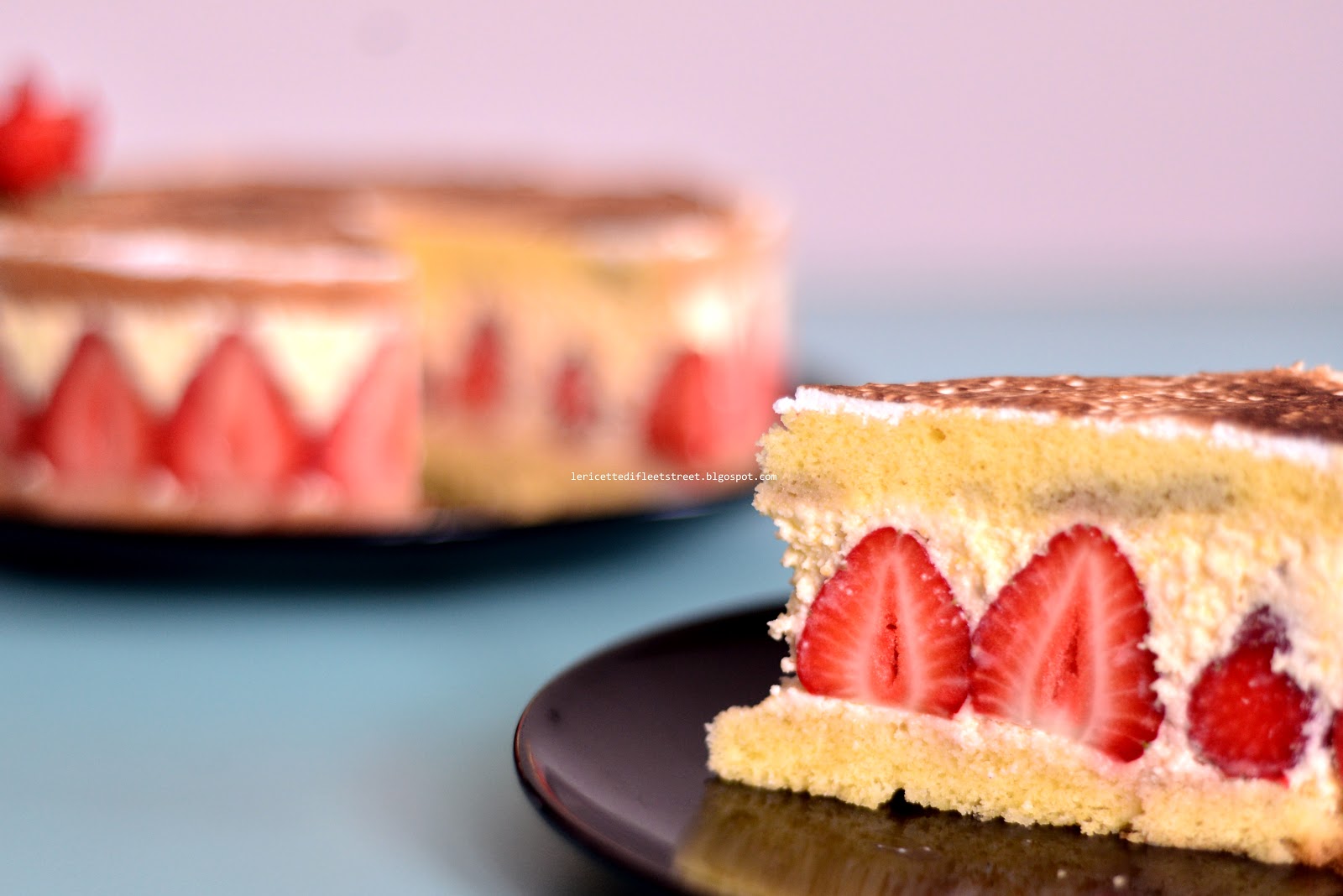 Versate quindi ½ della mousseline nella tortiera. Completate aggiungendo il resto delle fragole e coprite completamente con il resto della mousseline. Bagnate quindi anche il secondo disco di genovese col resto dello sciroppo e completate la torta. Mettete in frigo a raffreddare tutta la notte (se non avete un abbattitore).