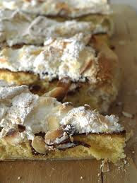 Preparare la meringa: montare a neve l’albume con uno sbattitore elettrico. Aggiungere lo zucchero e proseguire. Spalmare sulla torta il composto, sodo e ben amalgamato. Cospargere la meringa di mandorle in scaglie.
