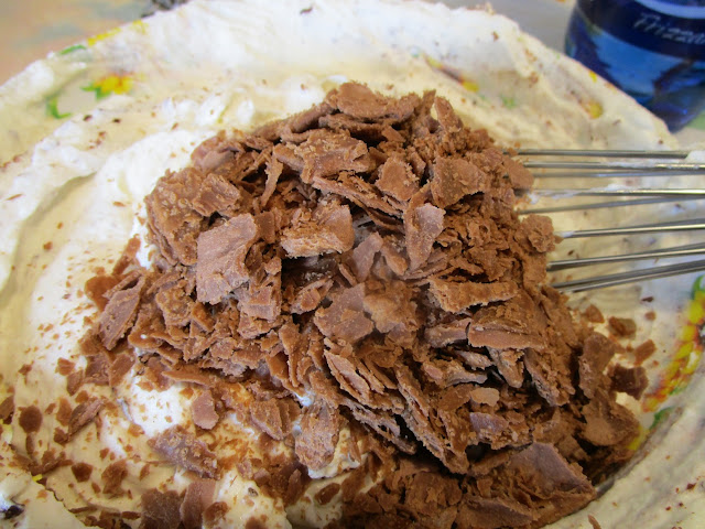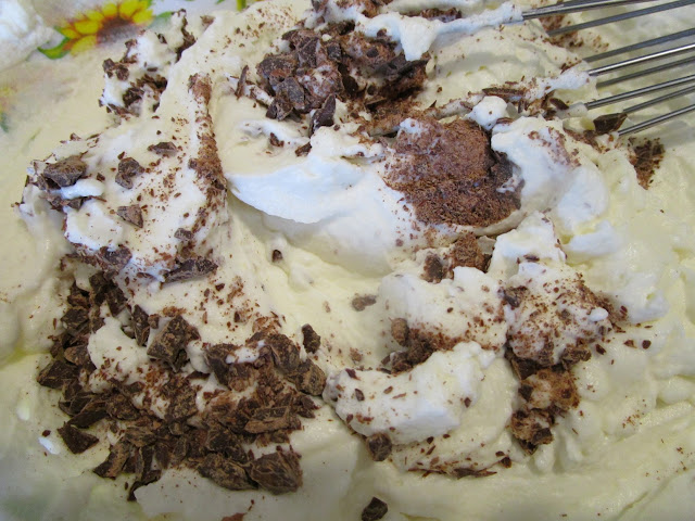 - – Montare la panna fresca con lo zucchero rimanente e aggiungerla, con molta delicatezza, alla crema di ricotta e alle scaglie di cioccolata.