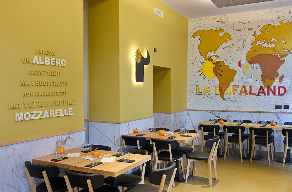 Anche in questo ristorante è stato infatti realizzato un murales che decora la parete più grande del locale e che raffigura la Bufaland, il mondo immaginario di Fratelli la Bufala, con l’indicazione delle città in cui il marchio è presente.