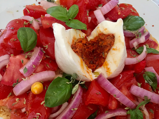 e poi conzatela cu a nzalata ‘e pumadori. Al centro versateci altri pomodori oppure, come ho fatto io, una bombetta di mozzarella con il cuore di nduja.