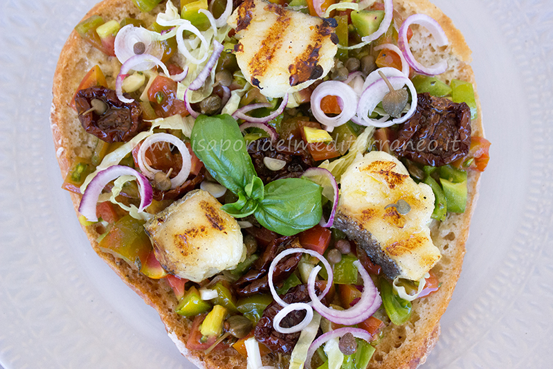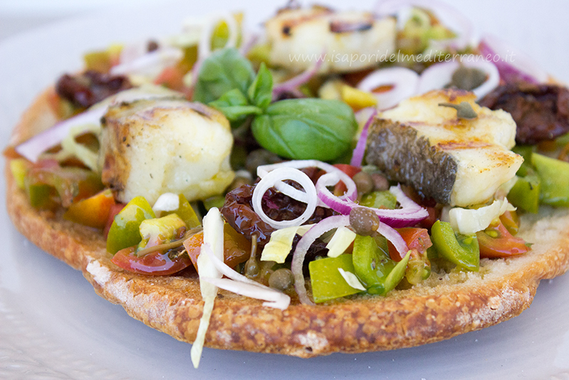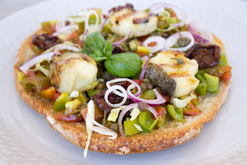 Fresella con pomodorino torpedino, cipolla di tropea, capperi, pomodori secchi, basilico e baccalà arrostito. Importante sempre la qualità degli ingredienti, la fresella è del panificio Europane di Marcianise sito a Via Gorizia n° 31; il pomodorino è il Torpedino una varietà rustica di pomodoro appartenente alla categoria dei Minisanmarzano; la Cipolla Rossa di Tropea IGP; i pomodorini secchi dell’azienda I Contadini di Felline, Ugento (LE); il Baccalà del consorzio Islanda; i Capperi dell’amico Pasquale raccolti a Pietravairano.In una zuppiera fate una bella insalata di pomodori Torpedino , mettendo olio extravergine, quello buono, aglio, origano e basilico, il sale lo mettete prima di mettere i pomodori sulla fresella. Lasciate riposare in frigo per tre quattro ore circa. Fate rinvenire per circa dieci minuti i pomodorini secchi in un bicchiere con tre parti di acqua e una di aceto. Passato il tempo conditeli con olio extra vergine e capperi. Su una bistecchiera arrostite il baccalà tagliato a bocconcini, mi raccomando bagnatelo con l’olio extra vergine prima di metterlo sulla bistecchiera rovente.