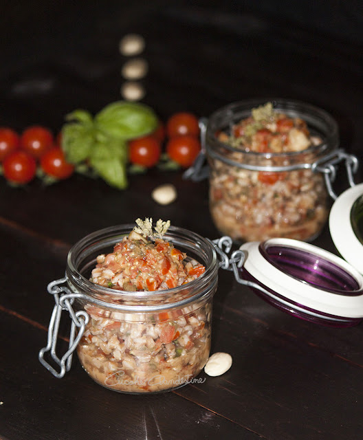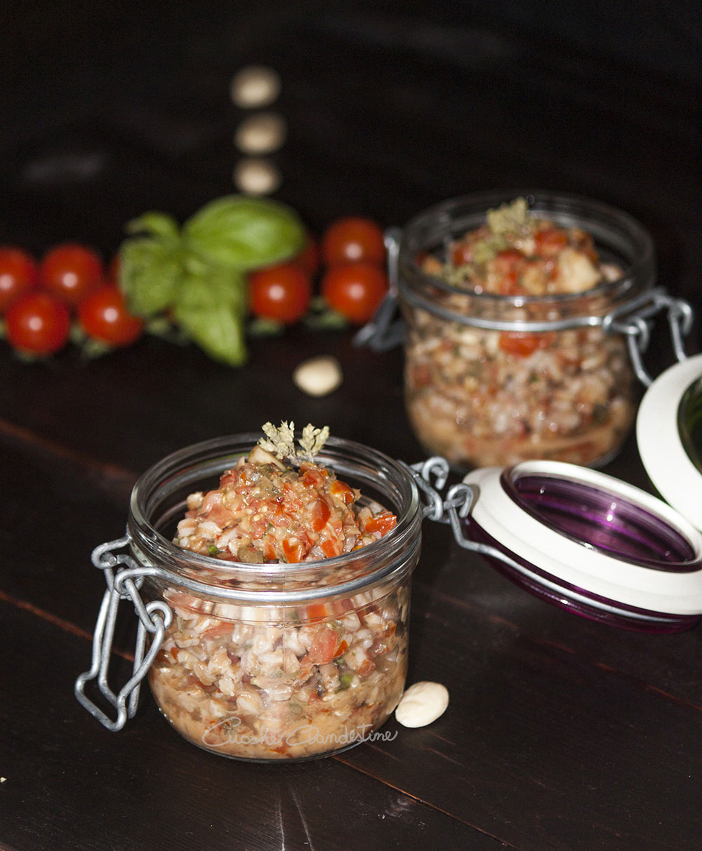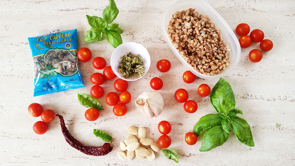 English. The Pesto a la Pantesca is a typical sauce of the Island of Pantelleria, South of Sicily, in Southern Italy. The main ingredient of this recipe is a characteristic product of the island: the caper. The peculiarity of this sauce is that it does not need to be cooked: it is a raw preparation and needs only a few minutes to be done. With the “Pesto a la pantesca” you can dress a dish of pasta or some “bruschetta” (toasted bread): this time we seasoned some spelt grains to get a refreshing summer cold salad.