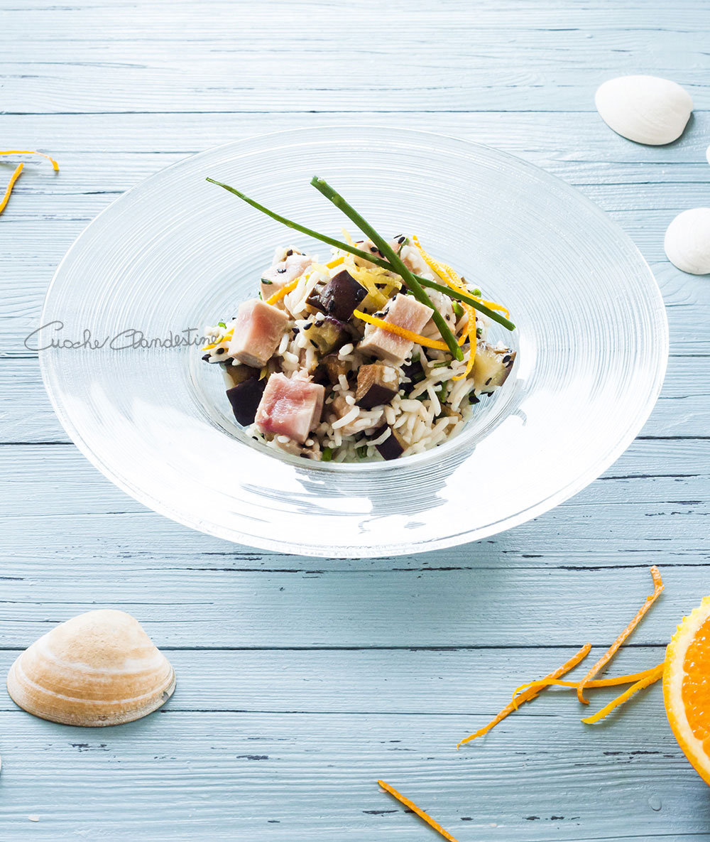 Add the eggplants, the tuna cubes and the sauce to the rice: combine.