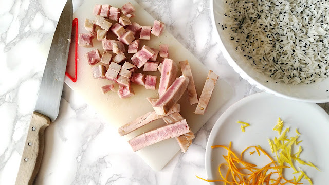 Place the rice into the serving dish and decorate with citrus zest and chives leaves.