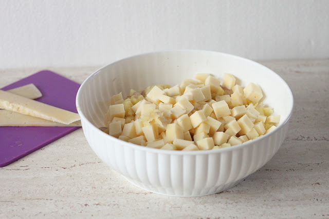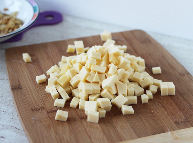 English - Dice the cheese, throwing away the crust.