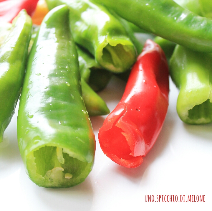 Nel frattempo private i friggitelli del loro picciolo e semini. Lavate bene i friggitelli in modo da rimuovere tutti i semini.