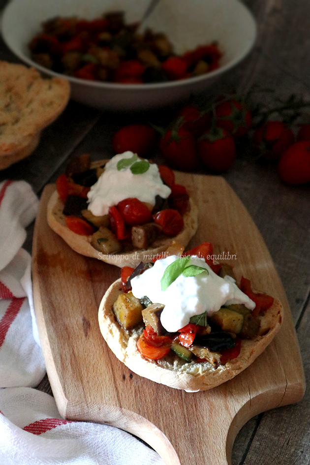 Io per facilitare l’ho sempre chiamata ortolana estiva, la cuocio in forno tutte insieme, oppure friggo in padella separatamente gli ortaggi, per poi farli insaporire insieme, come ho fatto in questo caso. Questi insieme di ortaggi fritti, li ho messi su una frisella con l’aggiunta della burrata.