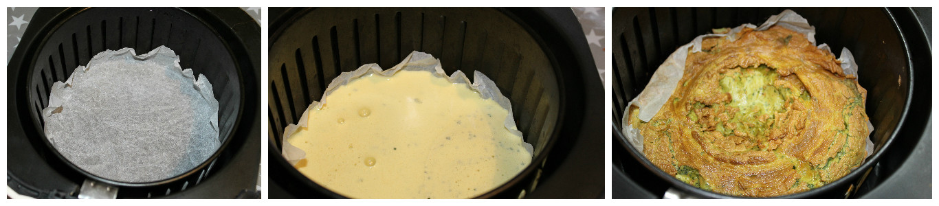 Rimettete la carta forno nel cestello e versateci metà pastella sopra. Delicatamente per non versare tutto fuori, chiudete la friggitrice e cuocete per 12 minuti a 180°, passato questo tempo controllate la frittata e se il centro è ancora umido proseguite ancora per un paio di minuti.
