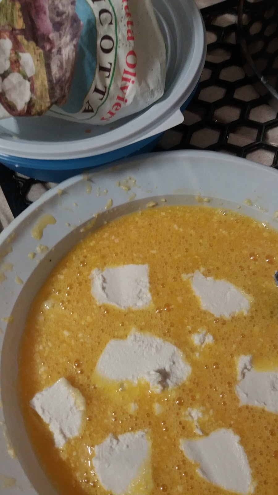 A uova sbattute con parmigiano,romano grattugiato,sale e pepe unire ricotta a pezzi
