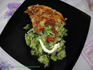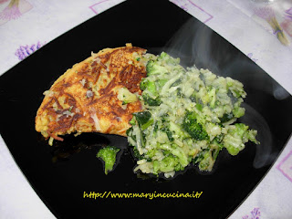 Sbucciare le patate e tagliarle a fiammifero. Tagliare finemente anche il broccoletto. Mescolare la farina di ceci con tanta acqua quanta ne serve per ottenere una pastella liscia. Aggiungere un pizzico di sale e mescolare ancora. Dividere le patate in due parti. Una parte cuocerla in padella con i broccoletti ed un filo d’olio, mescolando di tanto in tanto ed aggiungendo un po’ d’acqua. In un’altra padella cuocere le altre patate con un filo d’olio. Quando si saranno uniformemente dorate aggiungere la pastella e lasciarla rassodare. Ripiegare in due quando sarà ben cotta esternamente a fiamma bassa. Rigirare e proseguire ancora qualche minuto. Impiattare ed accompagnare con un po’ di maionese vegan a piacere.