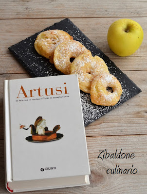 Oggi per l’occasione ho preparato le frittelle di mele, un classicone, tratto da “La scienza in cucina e l’Arte di mangiar bene di Pellegrino Artusi, edito da Giunti, un capolavoro che non poteva mancare nella nostra collezione di libri di cucina.