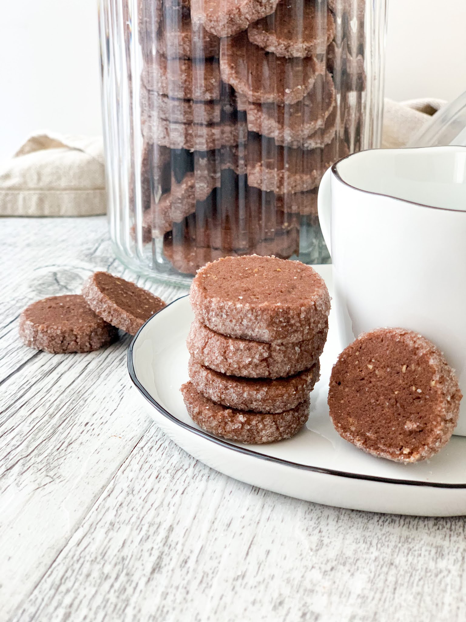 Per biscotti friabili ammorbidire l’impasto con le mani senza lavorarlo troppo. Fare dei cilindretti del diametro di 2-3 cm. Passare i cilindri nello zucchero semolato e poi in freezer per una decina di minuti. Tagliare a fette di circa 5 mm i cilindri. Adagiare i biscotti in una teglia ricoperta di carta forno. Cuocere a forno statico preriscaldato a 180°C per 10-12 minuti. Se infornate più teglie assieme utilizzare il forno nella modalità ventilato a 185°C.