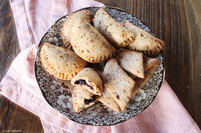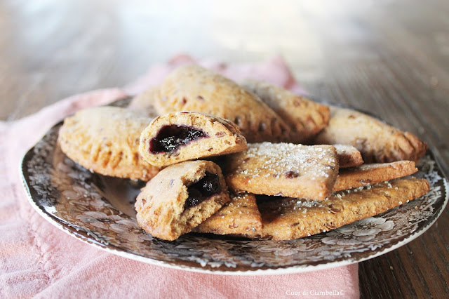 Impastare tutti gli ingredienti della frolla e creare un panetto omogeneo che andrà poi ricoperto con pellicola per alimenti e lasciato riposare in frigorifero per almeno un’ora. A questo punto se volete potete anche congelare la frolla (io vi consiglio di farne doppia dose proprio per questo motivo). Stendere la frolla dello spessore di 2-3 mm e con un coppapasta o un bicchiere ritagliare dei cerchi. Adagiare al centro un cucchiaino di marmellata, piegare a metà il cerchio fino a creare una mezza luna. Sigillare i bordi con i rebbi di una forchetta. Cuocere in forno statico a 180°C per circa 18-20 minuti.