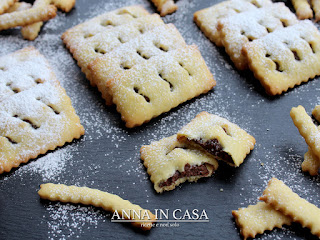 Tagliare dei rettangoli di cm 10×5. Appoggiare su metà dei rettangoli preparati un quadretto di cioccolato fondente. Coprire ogni rettangolo con un pari e con la rotella rifilare i bordi. A piacere fare dei taglietti con la rotella, sulla superficie di ogni frollino.