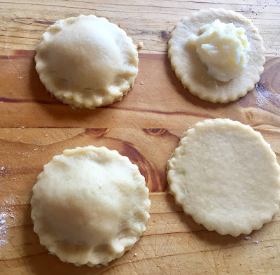 Stendete la frolla e ricavate dei cerchi. Versate al cento un cucchiaino di crema e ricoprite con un disco di frolla. Sigillate bene i bordi, magari aiutandovi con i rebbi di una forchetta.