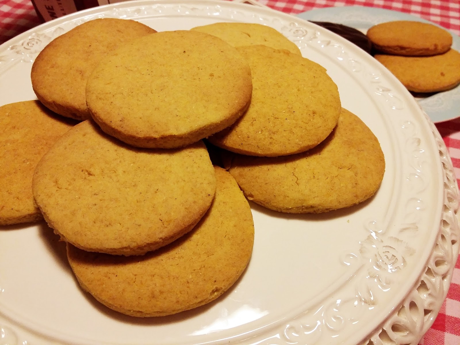 Trascorso questo tempo stendete l’impasto, alto tra 0,5 e 1 cm, e ritagliate i vostri biscotti. Potrebbe esservi utile dell’altra farina per stendere l’impasto: usate quella di riso. Io ho preferito fare questi frollini speziati grandi e tondi, con le forme semplici dei biscotti delle nonne. Trasferiteli delicatamente su una teglia coperta di carta forno e cuoceteli per 12 minuti in forno già caldo a 175°C.