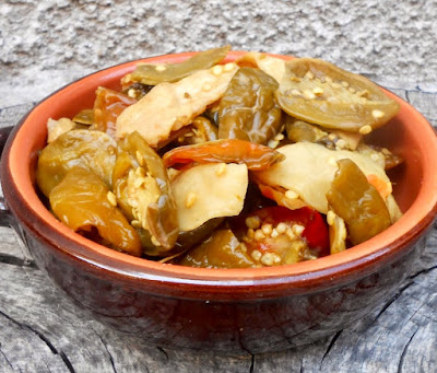 ‘U salaturi oltre a essere il caratteristico vaso in terracotta smaltata usato per le provviste, indica pure l’insieme degli ortaggi che vengono conservati sotto sale. Nella mia famiglia usiamo mettere sotto sale peperoni, melanzane e cipolle, altrove aggiungono anche olive schiacciate e fagiolini. In verità si utilizzano tutti quegli ortaggi che si hanno a disposizione, l’importante è che siano a Km 0. Una volta maturo‘u salaturi è ottimo fritto con le sarde sott’olio (qui) oppure per insaporire il pollo(qui).