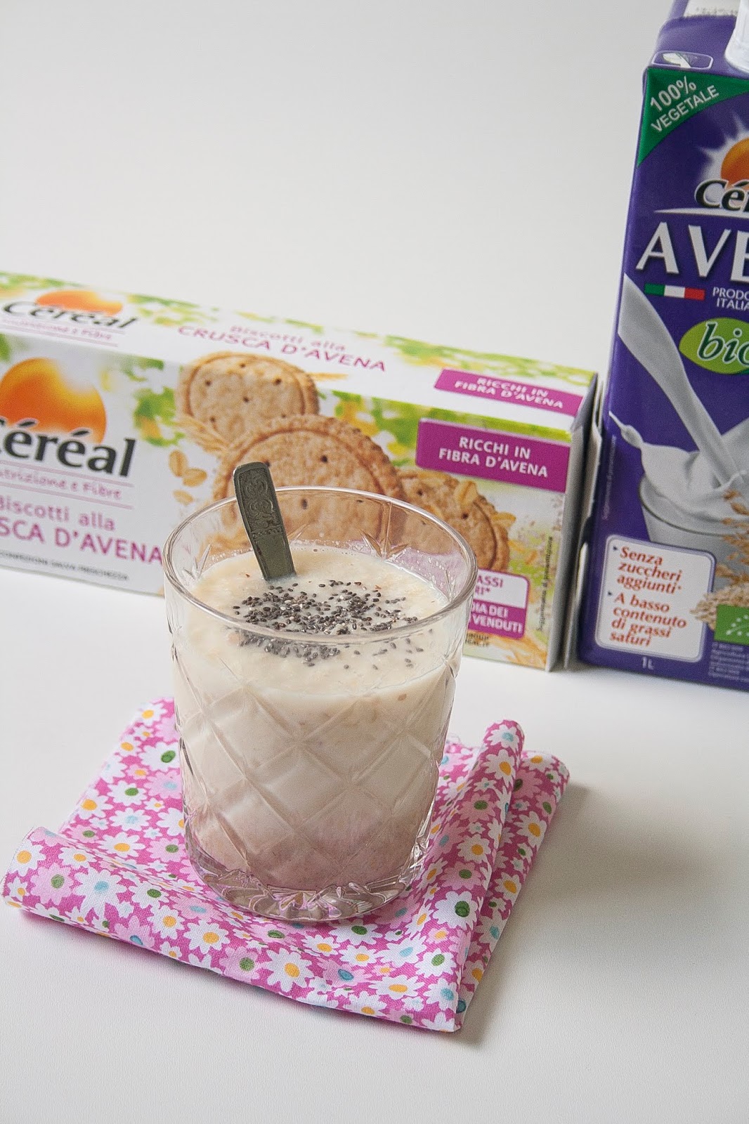 Il frullato con bevanda Avena Bio, Céréal biscotti alla crusca d’avena, mela, mandorle e semi di chia è pronto per essere servito!
