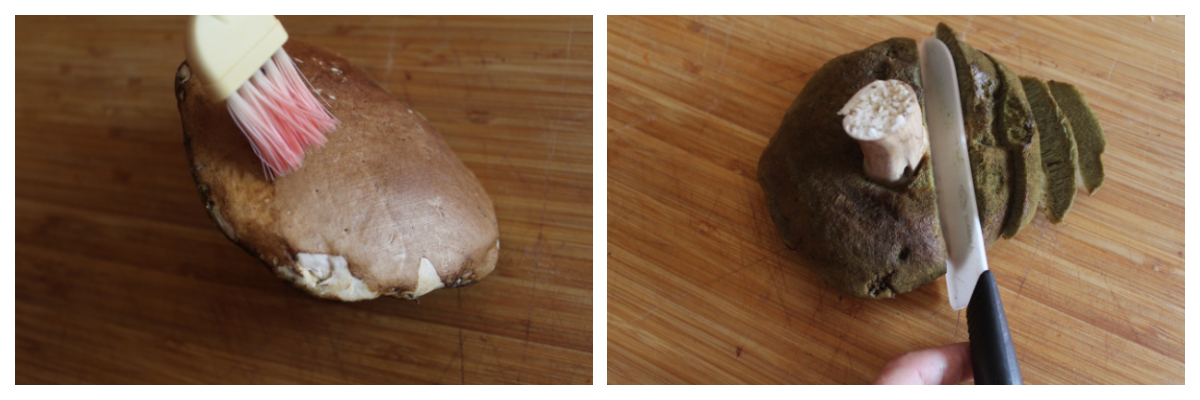 I funghi non vanno lavati sotto l’acqua ma spazzolati di tutte le impurità del bosco, se non possedete un pennello uno spazzolino utilizzate della carta da cucina. Una volta puliti tagliati gli affetti spesse quasi un centimetro e se riuscite cercate di tagliare delle fette che comprendono anche il gambo.