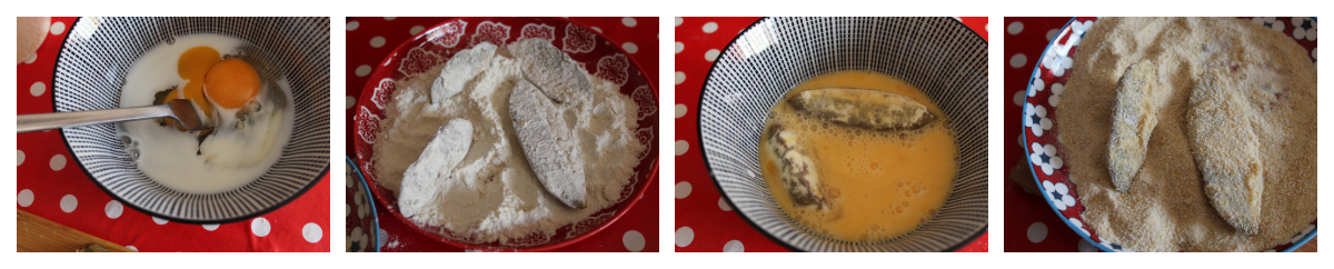 In una ciotola sbattete le uova con il latte e versate un po’ di farina e di pangrattato in due piattini.