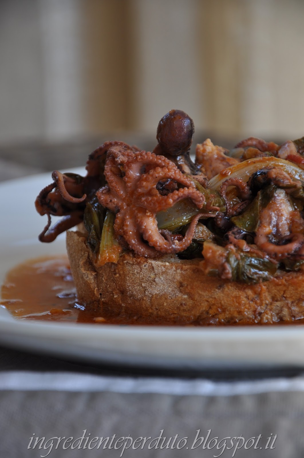 Alla fine otterremo un intingolo denso e scuro, i polpi ben teneri; mentre la preparazione riposa tostiamo del pane casereccio e serviamo poi i polpi e bietole fumanti sopra una bella fetta di pane tostato.