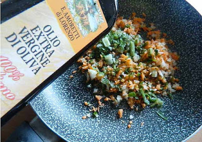 Sminuzzare carota, sedano e cipolla e fare rosolare le verdure per un paio di minuti nell’Olio Extra Vergine D’Oliva e,