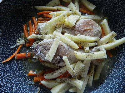 quindi aggiungere le patate, sale e pepe, coprire e lasciare cuocere per 15 minuti rigirando di tanto in tanto.