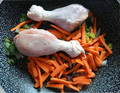 In una padella antiaderente mettere due cucchiai d’olio, il sedano, il rosmarino, la cipolla affettata, le carote e i fusi di pollo.