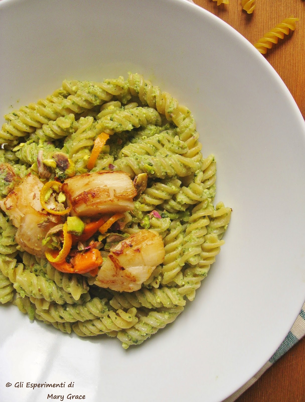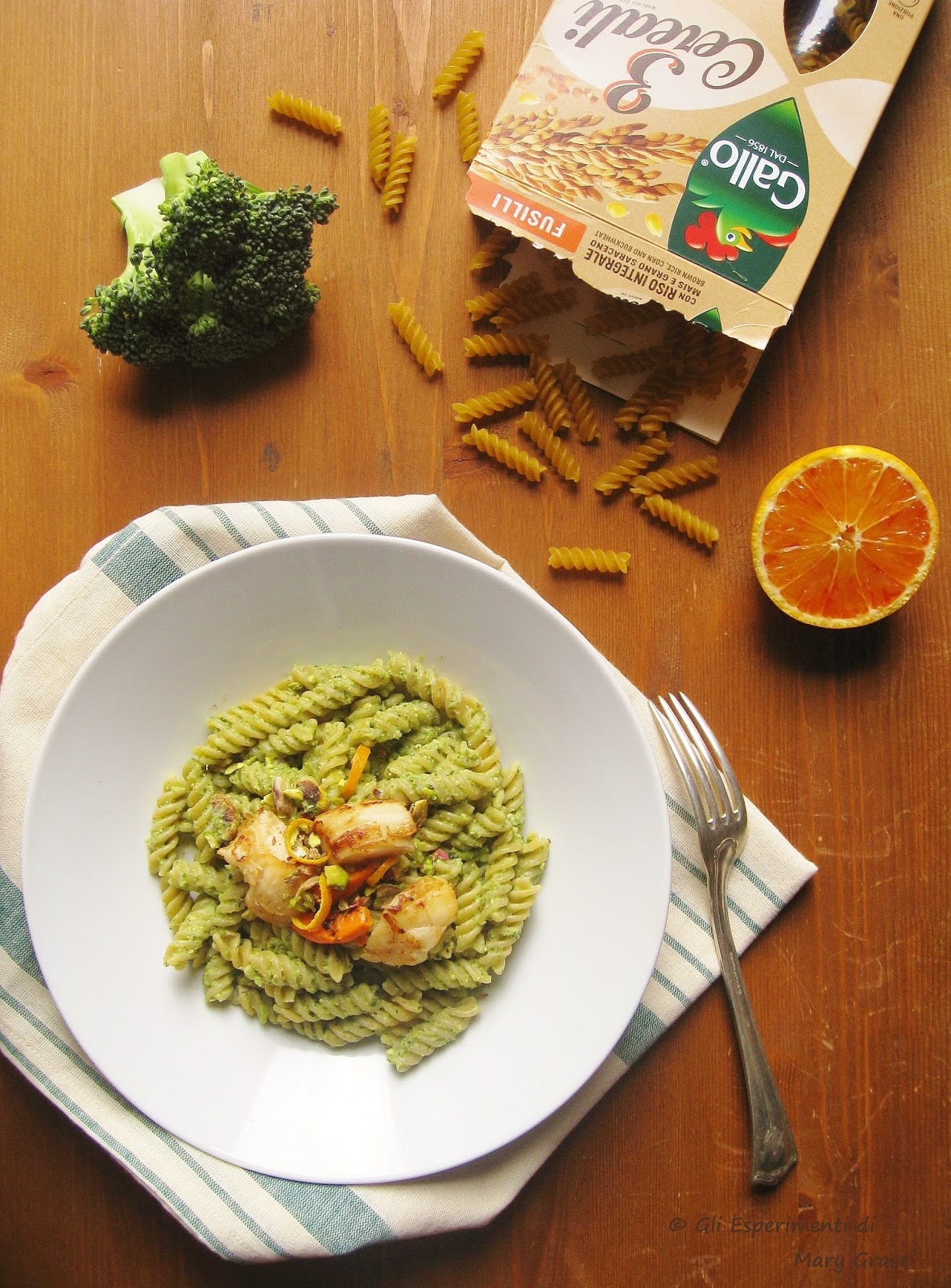 Per condire questa pasta senza glutine, ho pensato ad una salsa cremosa che la avvolgesse con delicatezza e sapore: l’abbinamento broccoli e pistacchi, accompagnato da qualche goccia di succo di arancia, mi è sembrato salubre e perfetto.