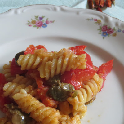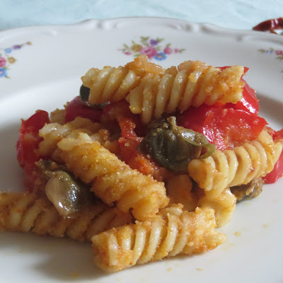 Cuocete la pasta al dente quindi saltatela in padella con il sughetto di peperoni e capperi e la mollica “atturrata” abbrustolita, mescolate bene e impiattate.