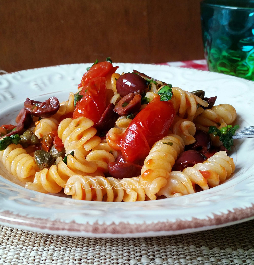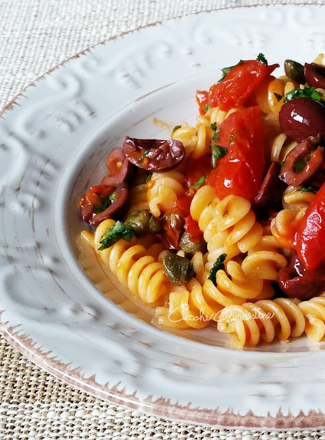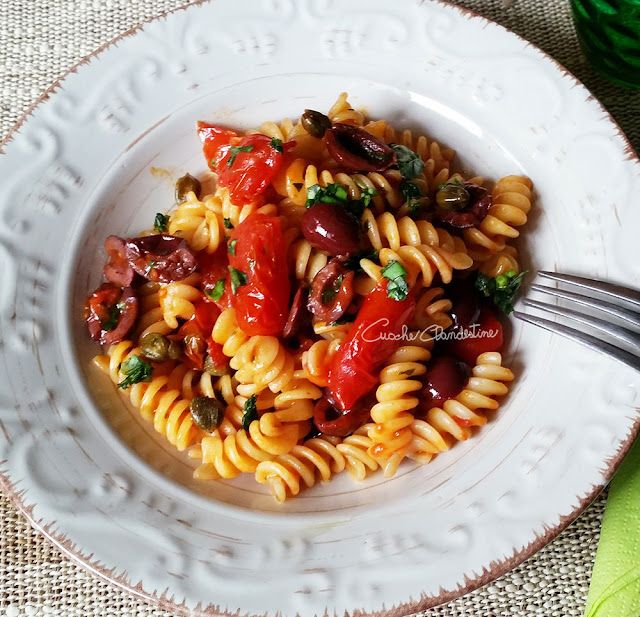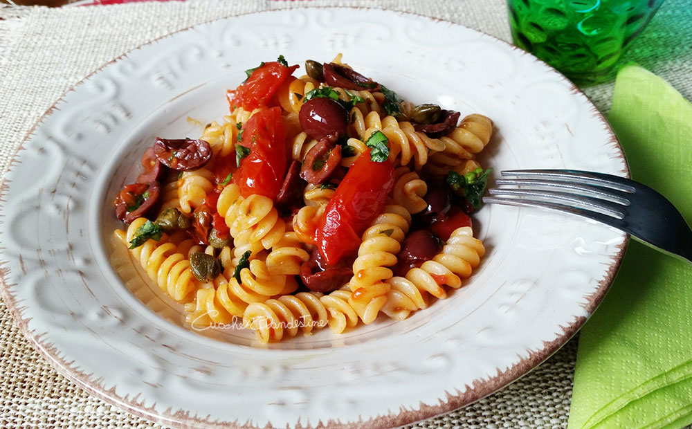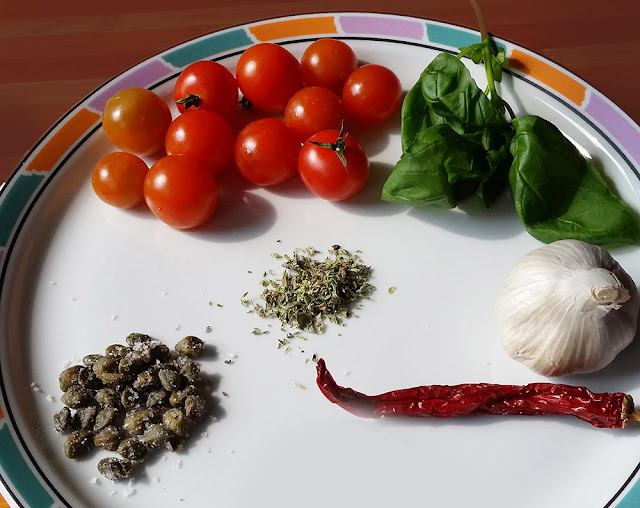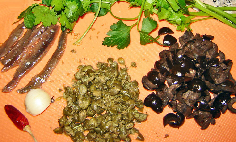 Lavate bene i capperi in modo che perdano il sale, poi tritateli grossolanamente. Tritate anche le olive e le erbe aromatiche, mettendole da parte. Poi mettete 4 cucchiai di olio e.v.o. in una larga padella su fuoco lento. Fate scaldare nell’olio l’aglio, il peperoncino e le alici, finché queste saranno sciolte. Aggiungete olive, capperi e pomodori, tutti tritati. Cuocete per 5 minuti a fuoco medio, affinché tutto si insaporisca bene.