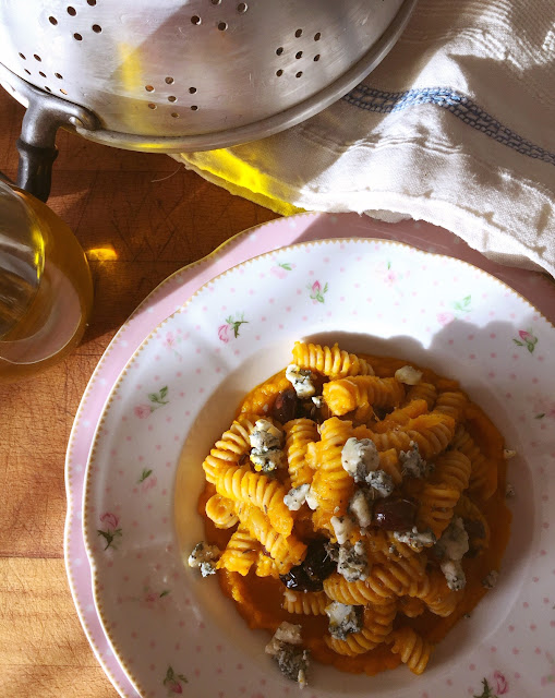 Essendo amanti della zucca, ed essendo di stagione, non poteva mancare una pasta con la zucca impreziosita dal sapore delle olive taggiasche, del finocchietto e soprattutto del blu di capra.