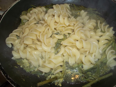 Versate la pasta nella padella con un mestolo di acqua di cottura, questo vi aiuterà ad insaporirla meglio e legarla al condimento.